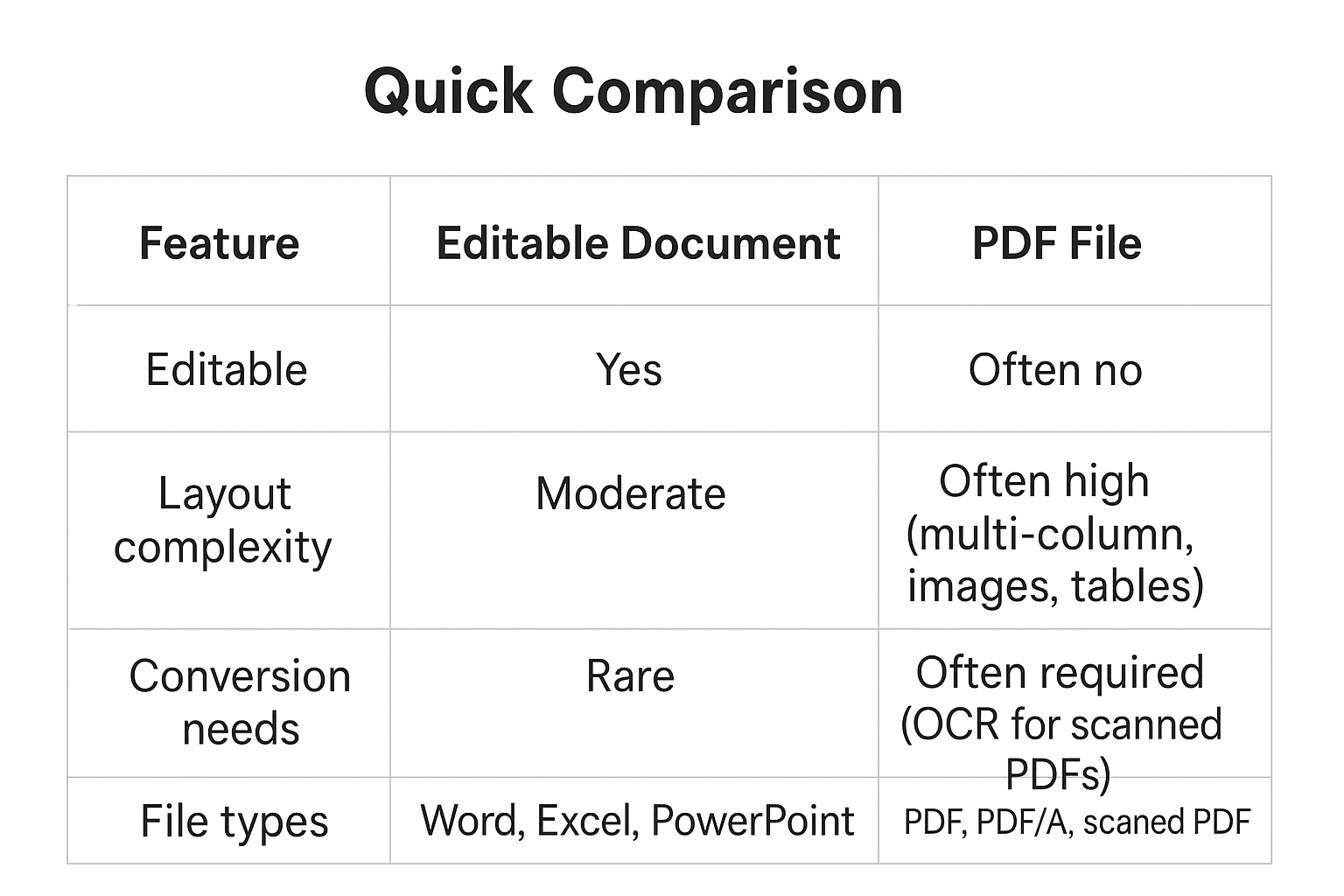 PDF files often add another layer of complexity. They may be non-editable or scanned, and can contain text, images, tables, forms, or multiple layers.